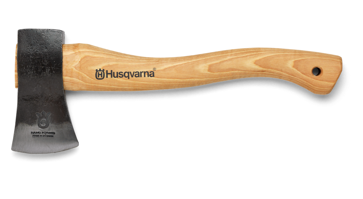En liten yxa för att hugga ved eller för trädgårdsarbete. Eggskydd i läder medföljer. Huvudet är fäst vid skaftet med både en träkil och en stålkil för att garantera säkerheten.